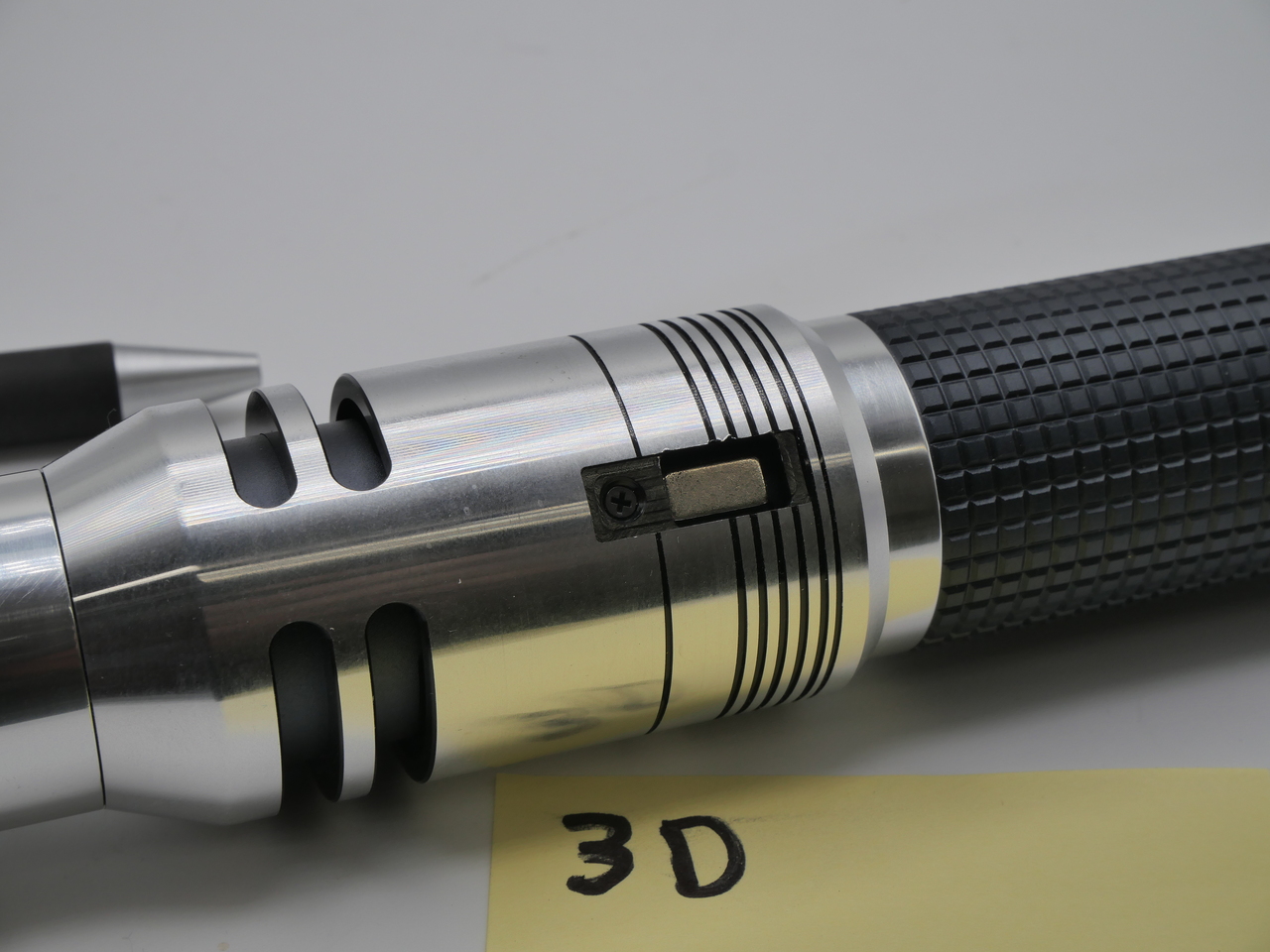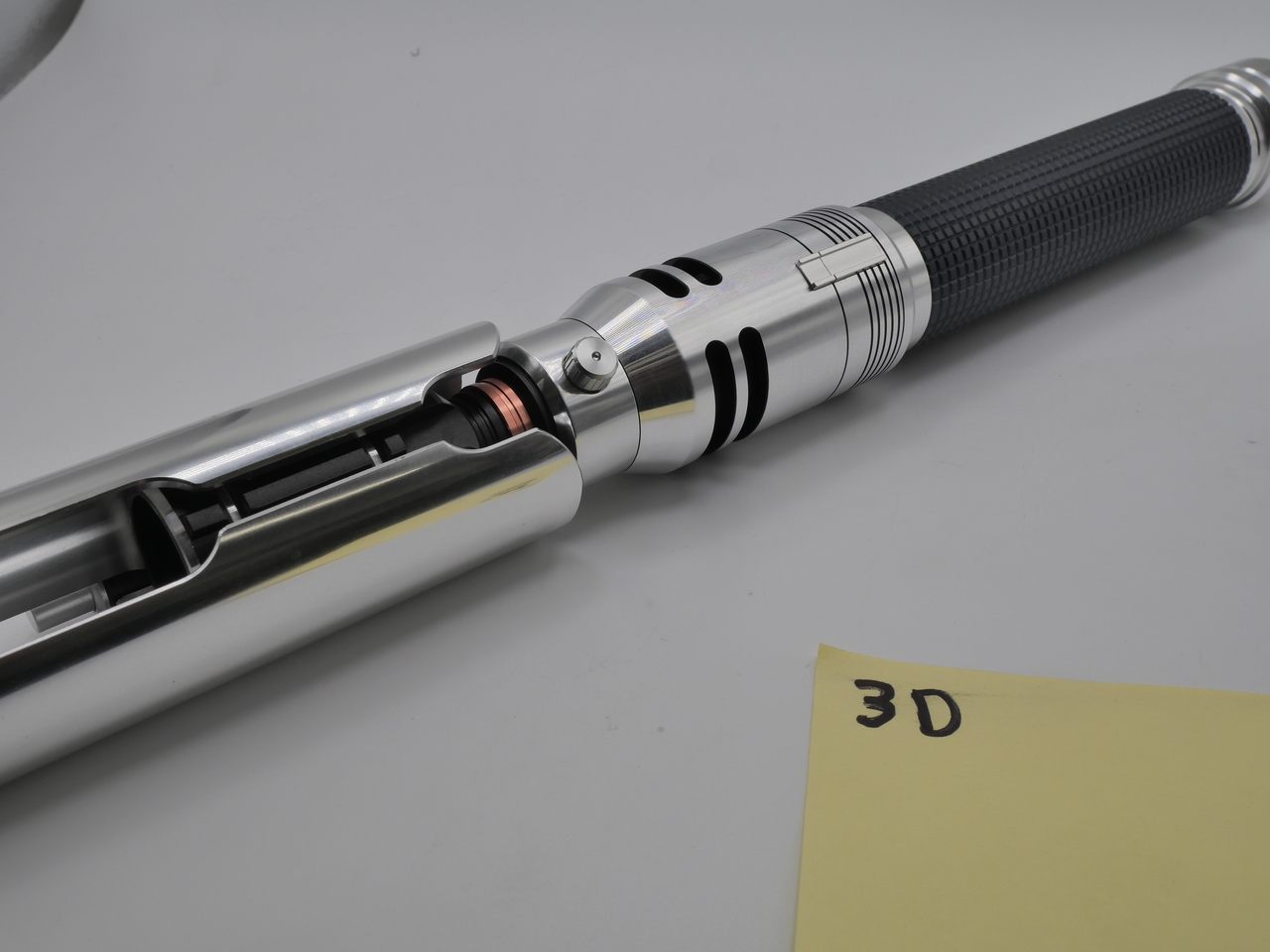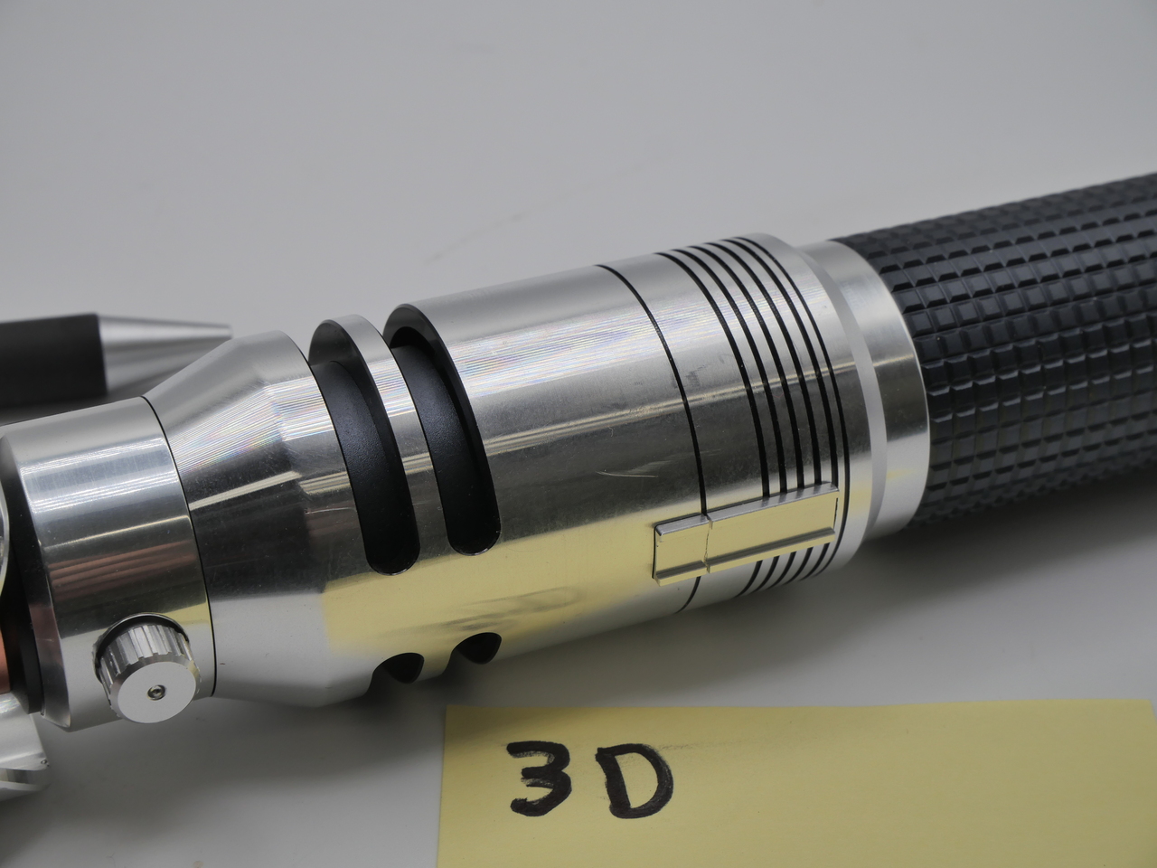 There is some scratching on the middle section the hilt on the polished aluminum. There is also a cover that fits over the hole leading to the screw to unattach the top from the bottom portions of the saber thats missing.