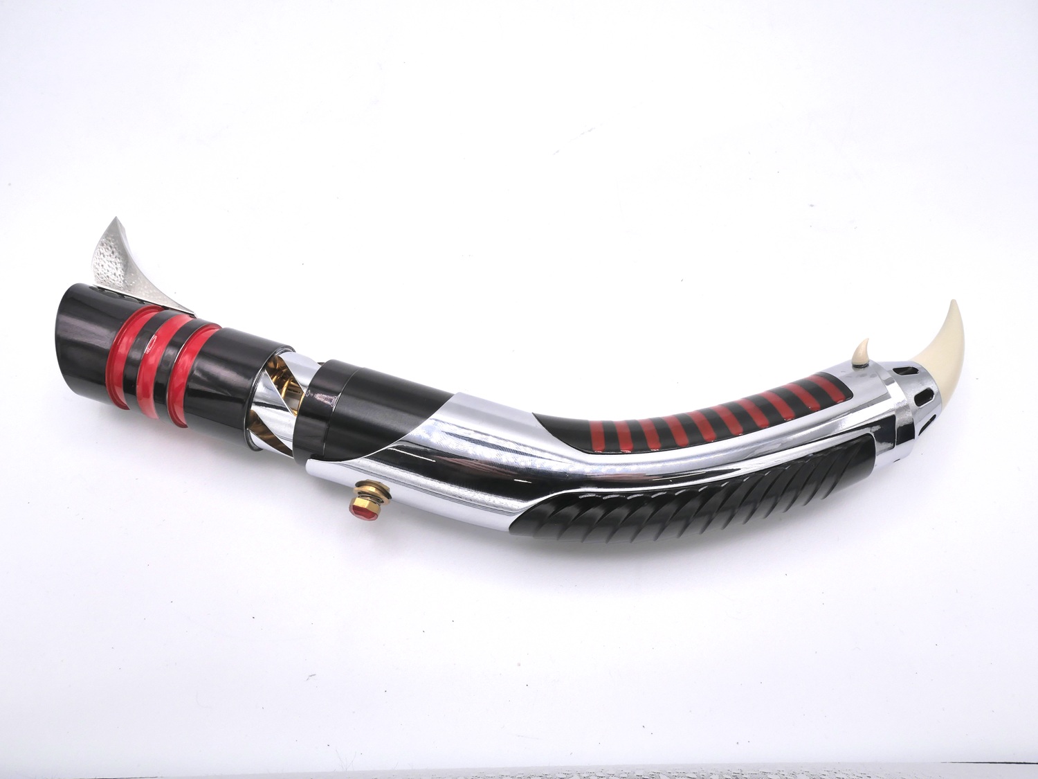 This isn't just another lightsaber. The sinister curved hilt. The legendary tooth embedded in the grip. The glowing crystal reveal chamber pulsing with dark side energy. Every detail screams pure Sith legacy.