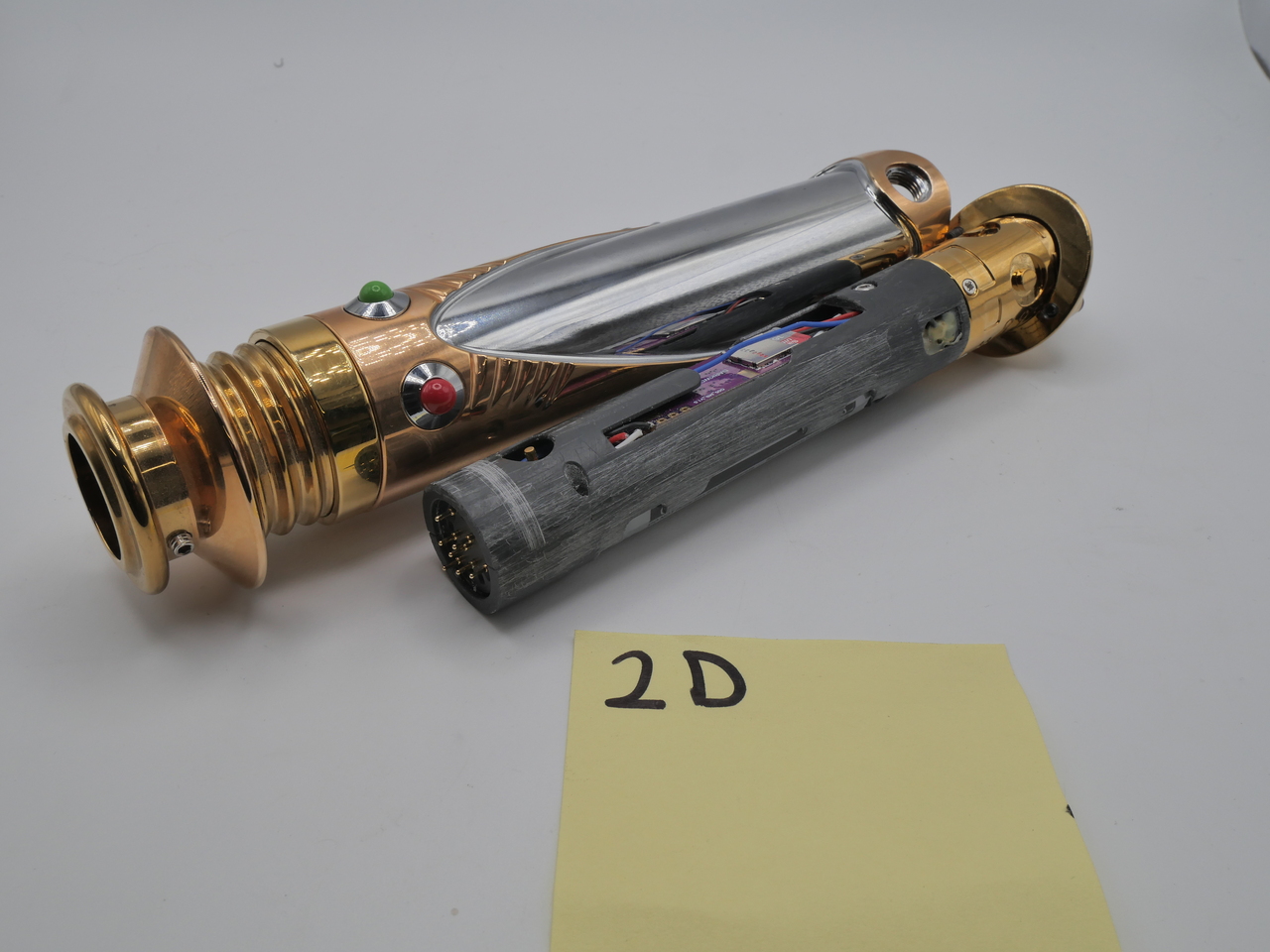 This is an installed combat version of the Sidious made by LGT, however the saber no longer is working and is old technology that cannot be fixed. Once assembled, it can be displayed and look great, but we do not think the internal chassis works as it once did, so consider it as a display only Emperor Palpatine saber. This is also missing a gold piece on the bottom of the saber.