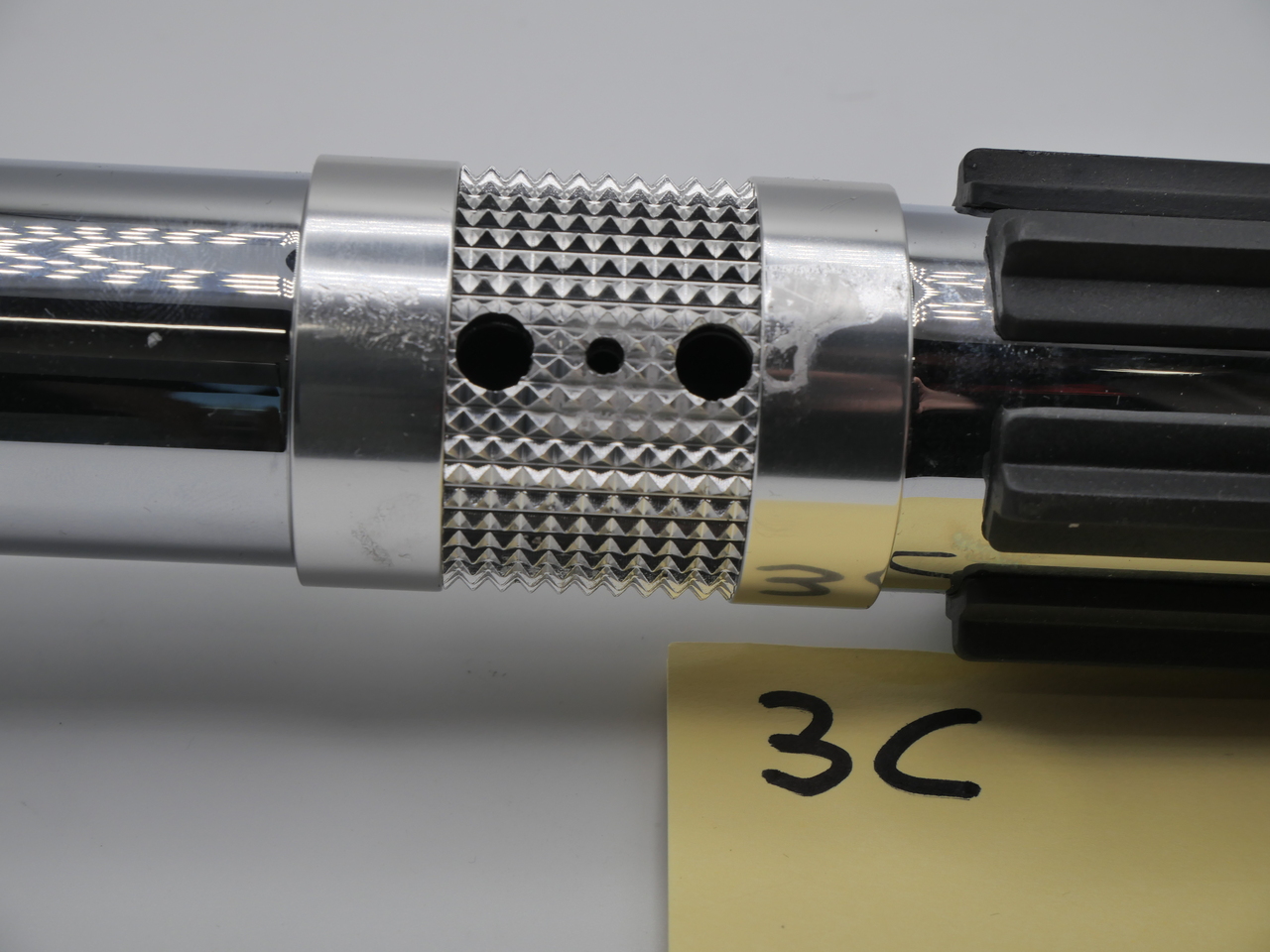 This anakin EP3 saber is missing its control box and has a sizable amount of glue residue over the chrome of the hilt.