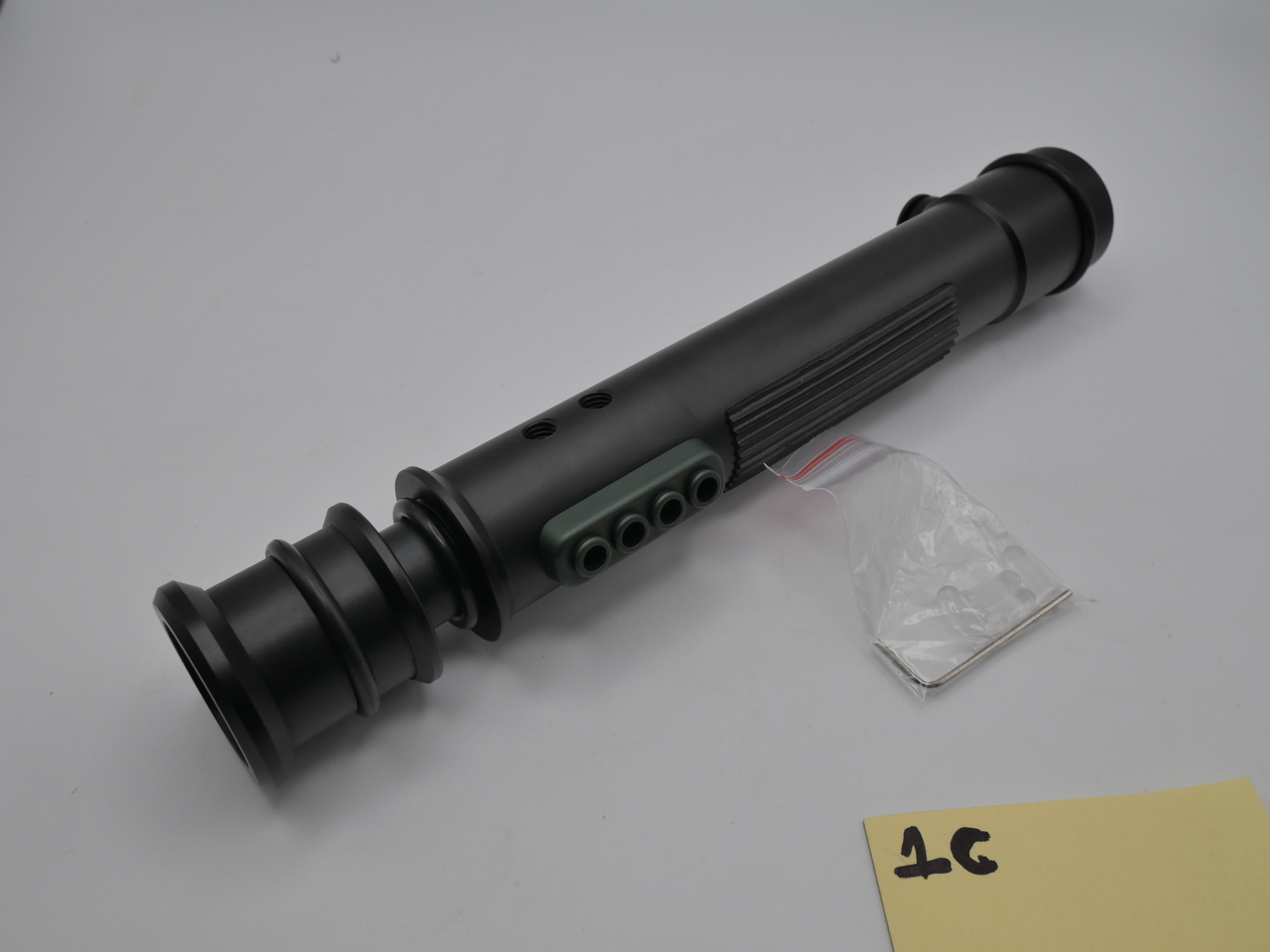 This black stealth trooper mcQuarrie KBX saber is missing both of the button housings and mechanisms leaving a couple holes on the side of the hilt. still looks great as a display hilt