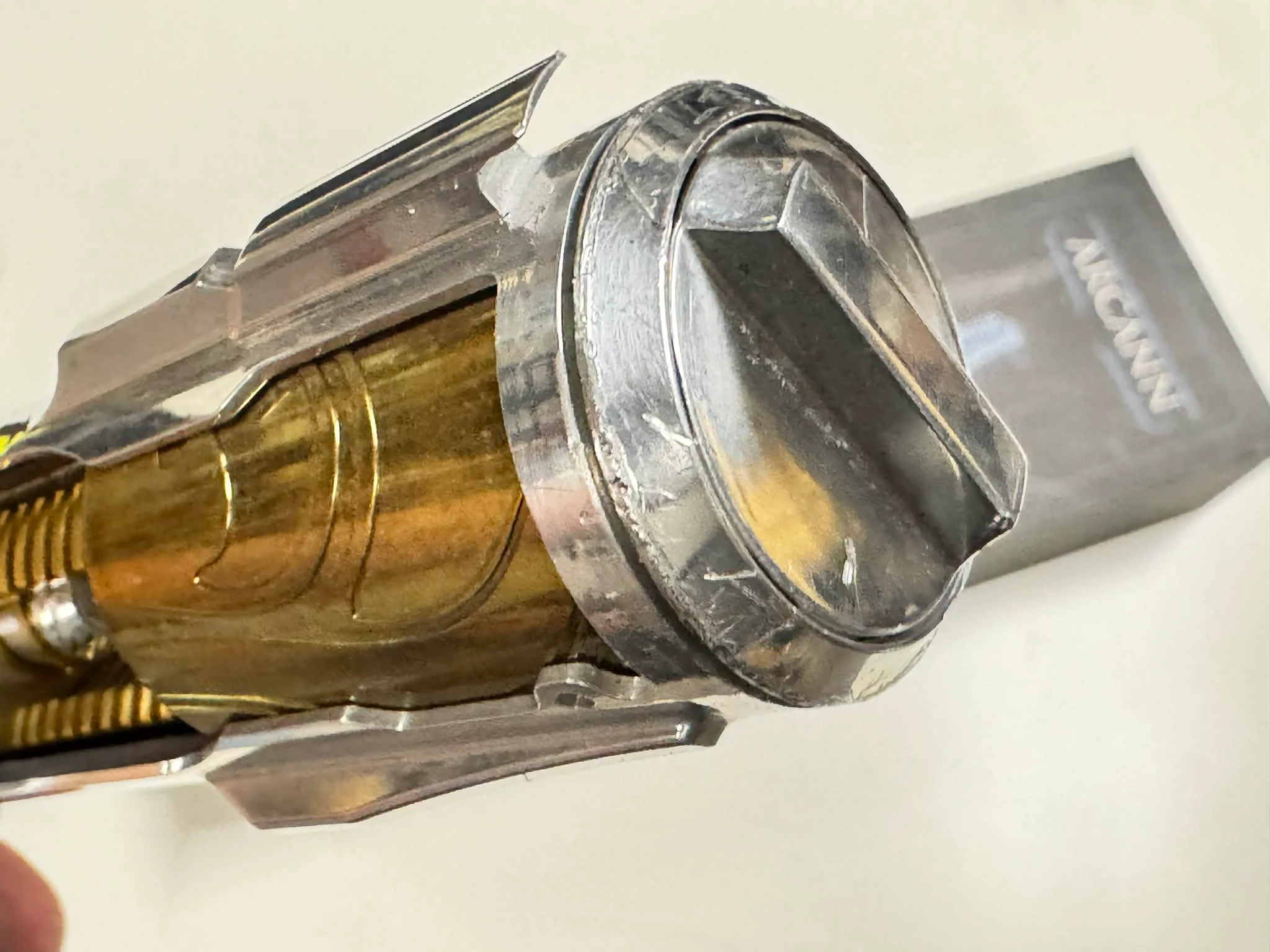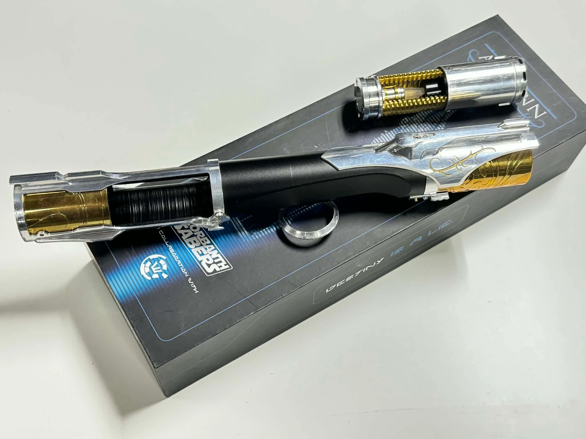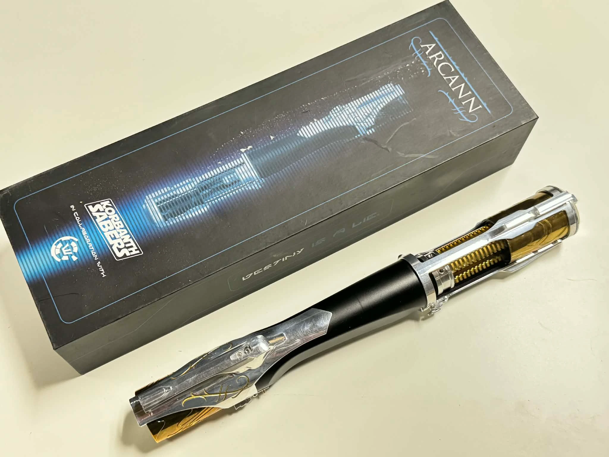 A 2022 version of Arcann designed by Shadowfoil, this empty hilt, is missing some of the internal crystal part, has alot of scratches on pommel ring, and some chrome flaws. kinda cool but can still be displayed, but probably not installed