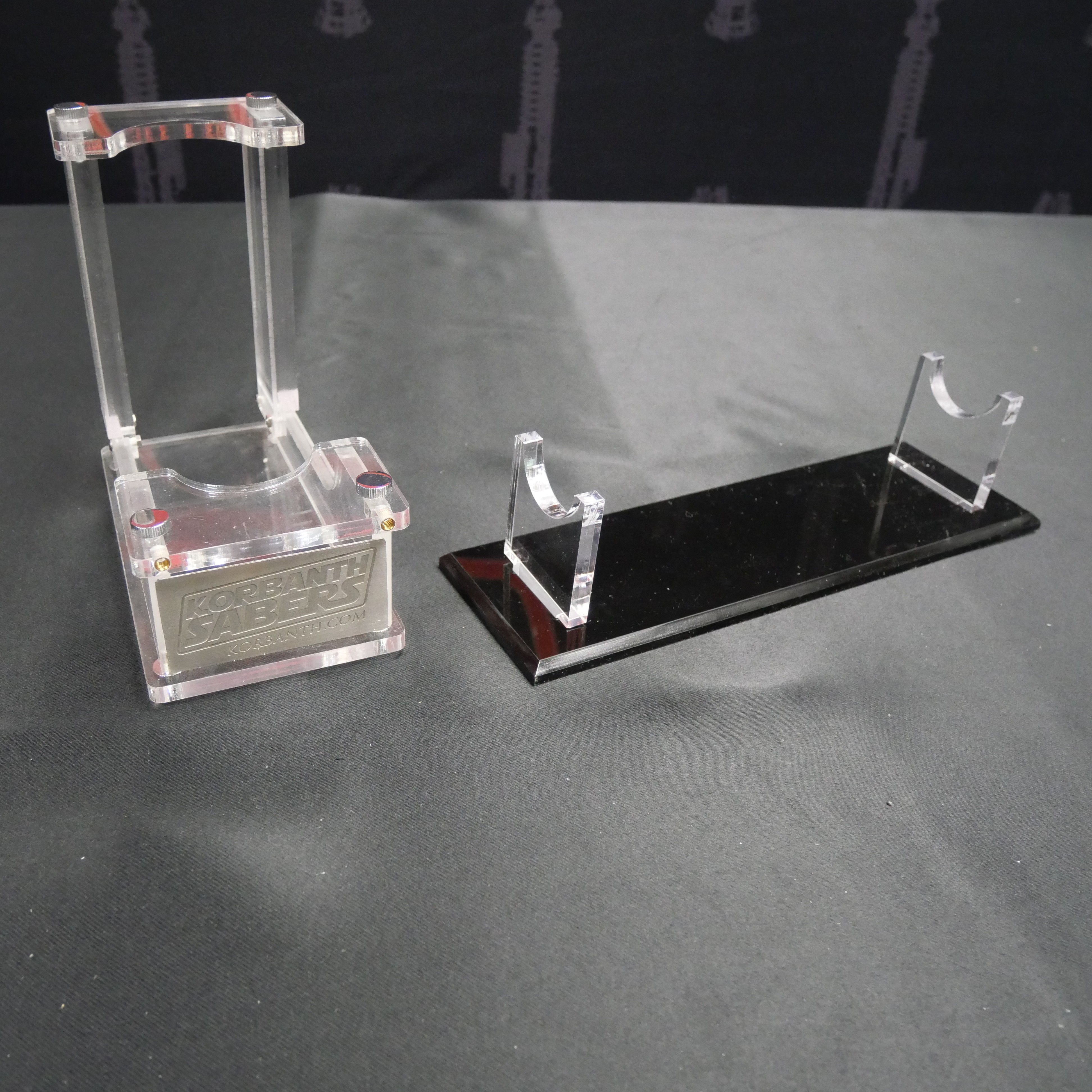 This saber stand is clear acrylic with polished aluminum. Comes with a metal Korbanth Plaque. It comes disassembled but is sent with all hardwear needed. Very easy assembly.